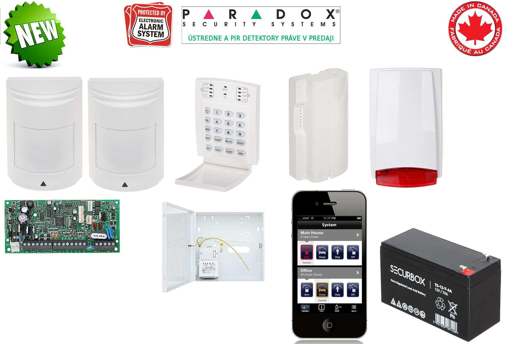 Paradox SPECTRA SP4000 4(8) zónová ústredňa + 1 ks K10 LED klávesnica + kovová skrinka + napájací zdroj+ 2ks PIR pohybové čidlo Paradox 476 alebo ALEPH AL40E- PIR PET + GSM modul PCS250 + externá siréna SP 5010R + akumulátor 12V 4,5Ah.