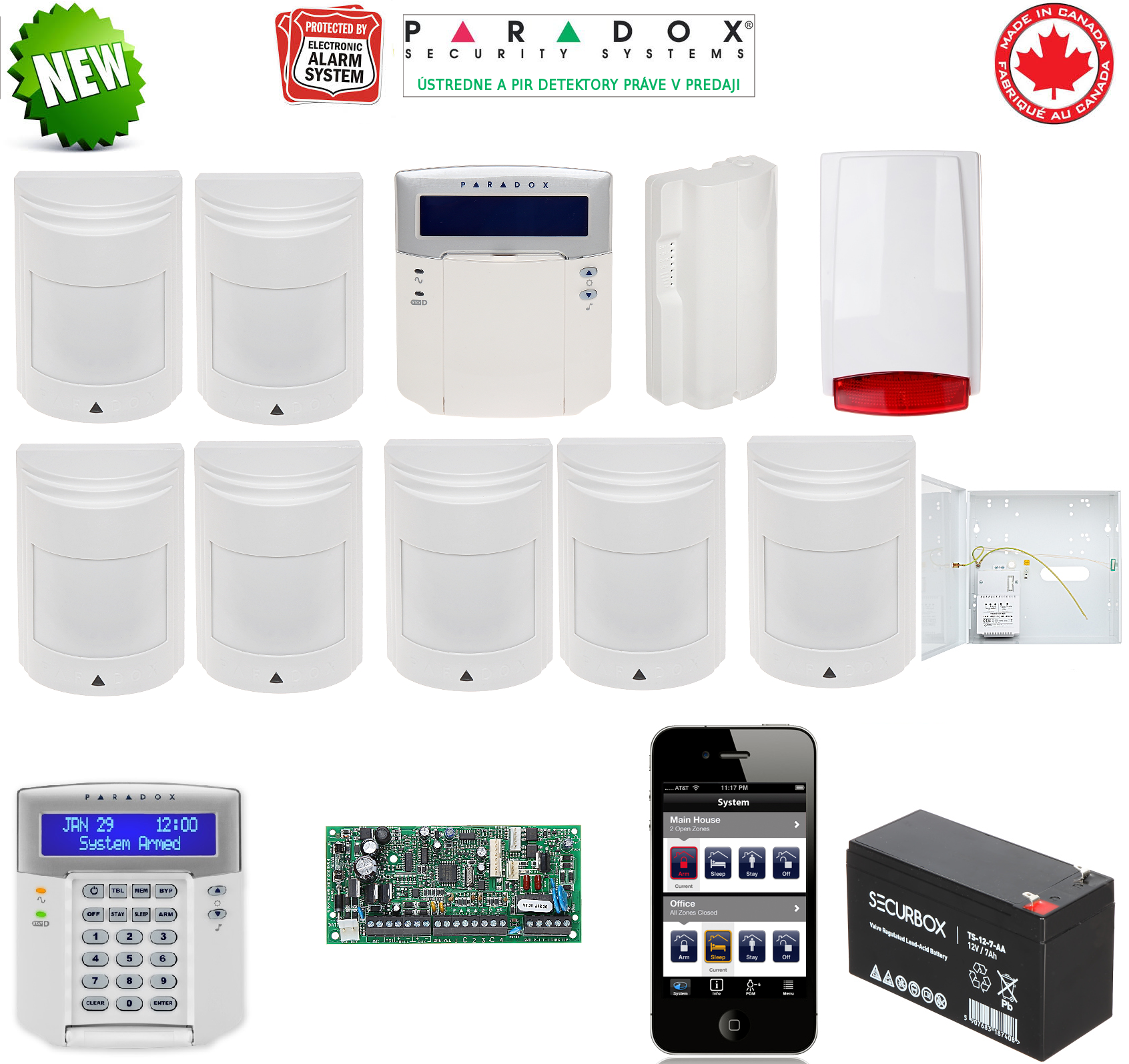 Paradox SPECTRA SP4000 4(8) zónová ústredňa + 1 ks K32 LCD klávesnica + kovová skrinka + napájací zdroj+ 8ks PIR pohybové čidlo Paradox 476 alebo ALEPH AL40E- PIR PET + GSM modul PCS250 + externá siréna SP 5010R + akumulátor 12V 7Ah.
