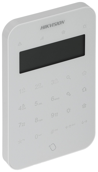 Spolupráca: Bezdrôtové poplašné systémy HIKVISION AX PRO ; Dosah rádiovej komunikácie (na otvorenom priestranstve): 1200 m ; Hlavné vlastnosti: Biele podsvietenie tlačidiel, Zabudovaná bezkontaktná čítačka RFID ;