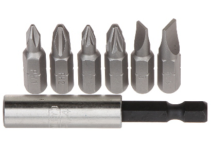 Komplet bitov s magnetickým úchytom; Veľkosti koncoviek: Philips : PH1, PH2, Pozidriv : PZ1, PZ2, Plochý : 5.0 mm, 6.5 mm ; Hrúbka nástavca bitu: 1/4 " ; Vybrané vlastnosti: Produkt je vyrobený z chróm-vanádiovej ocele ;