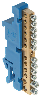 Svorkovnica na použitie s modulovými rozdeľovačmi ; Počet svoriek: 10 Ø 4 mm (skrutkové svorky) + 2 Ø 5 mm (skrutkové svorky) ; Farba: Modrý ; Rozmery: 84 x 12 x 38 mm ;