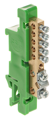 Svorkovnica na použitie s modulovými rozdeľovačmi ; Počet svoriek: 5 Ø 4 mm (skrutkové svorky) + 2 Ø 5 mm (skrutkové svorky) ; Farba: Zelený ; Rozmery: 84 x 12 x 38 mm ;