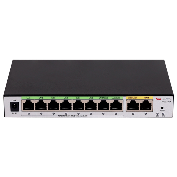 Porty LAN: 8 x LAN & PoE / WAN ; Rozhranie WAN: 2 x WAN / LAN ; Prenosová rýchlosť: 10/100/1000 Mbps ; Napájanie PoE: PoE (802.3af/at), 75 W (celkom) ; Rozhranie správy: Podpora HPP - Hik-Partner Pro ; Vybrané vlastnosti: Rovnomerne zaťaženie pásma, Siete VPN: IPsec VPN, L2TP VPN ;