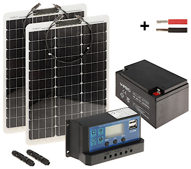 V sade: 2 solar panels 50 W, Akumulátor 26 Ah, Solárny regulátor nabíjania akumulátorov - 20 A, PWM, Pripojovacie káble : 2 x 10 m, MC4 konektory - 2 ks. ;