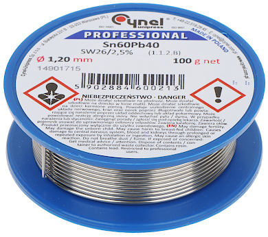 Balenie: Cievka ; Priemer: 1.2 mm ; Zloženie zliatiny: 59.5 ... 60.5 % Sn 38.8 ... 40.5 % Pb ; Tavivo: SW26 ; Obsah taviva v spojive: 2.5 % ; Hmotnosť: 100 g ;
